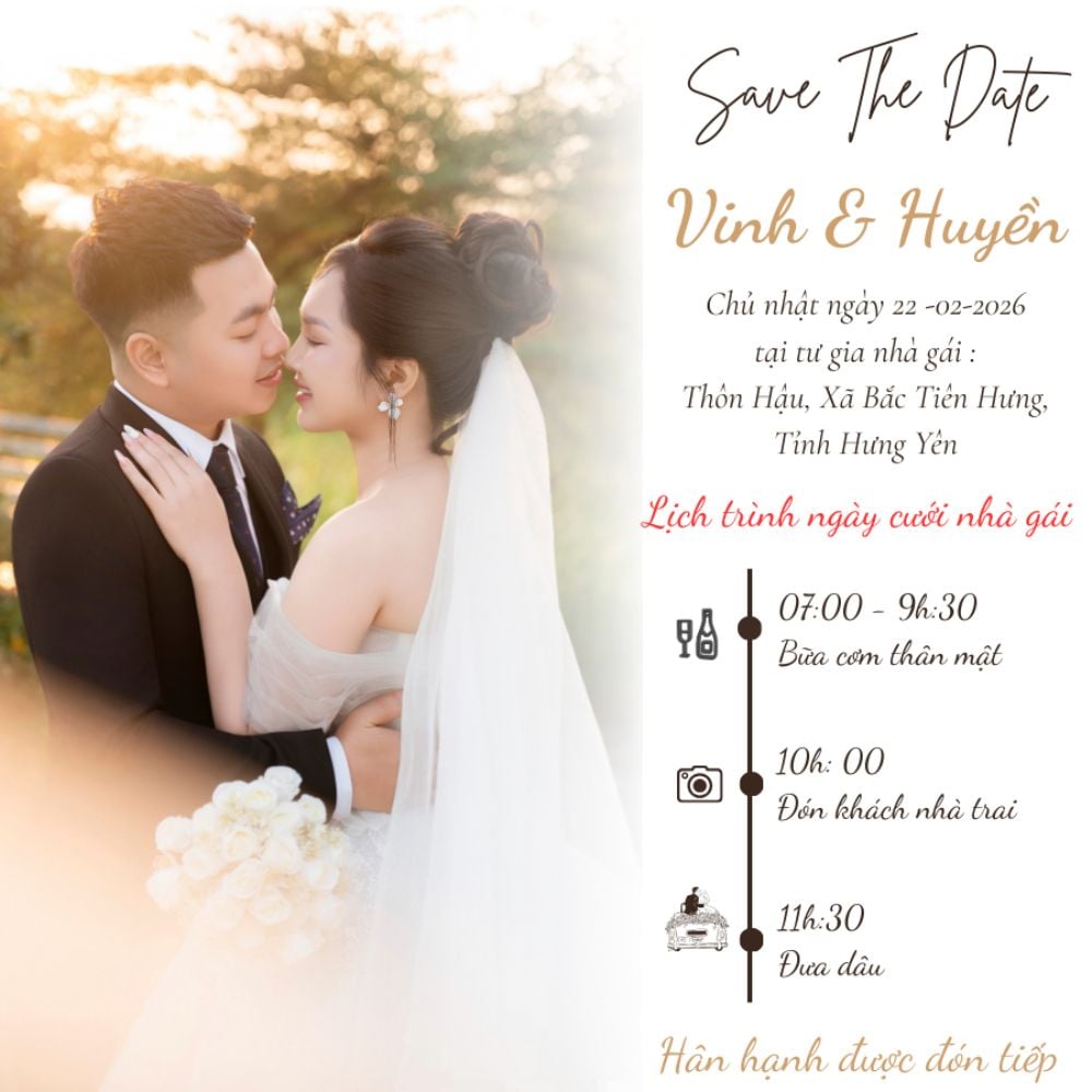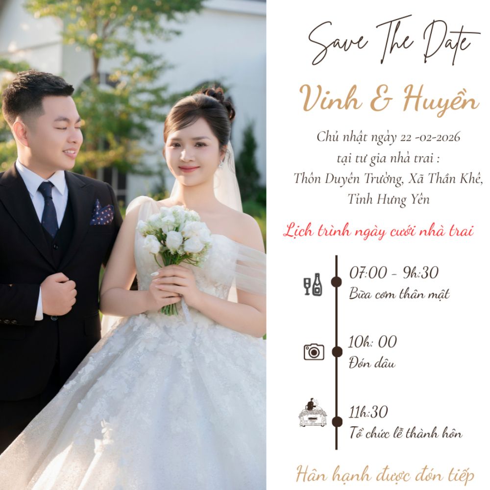February 22 2026Cuối cùng ngày vui nhất của chúng mình cũng tới rồi. Cảm ơn vì chúng ta đã luôn là một phần trong cuộc sống của nhau. Em và anh không chỉ là người yêu mà còn là tri kỷ, là bạn đồng hành. Kể từ Ngày hôm nay, em là Vợ, anh là Chồng và chúng ta là Một gia đình hạnh phúc.